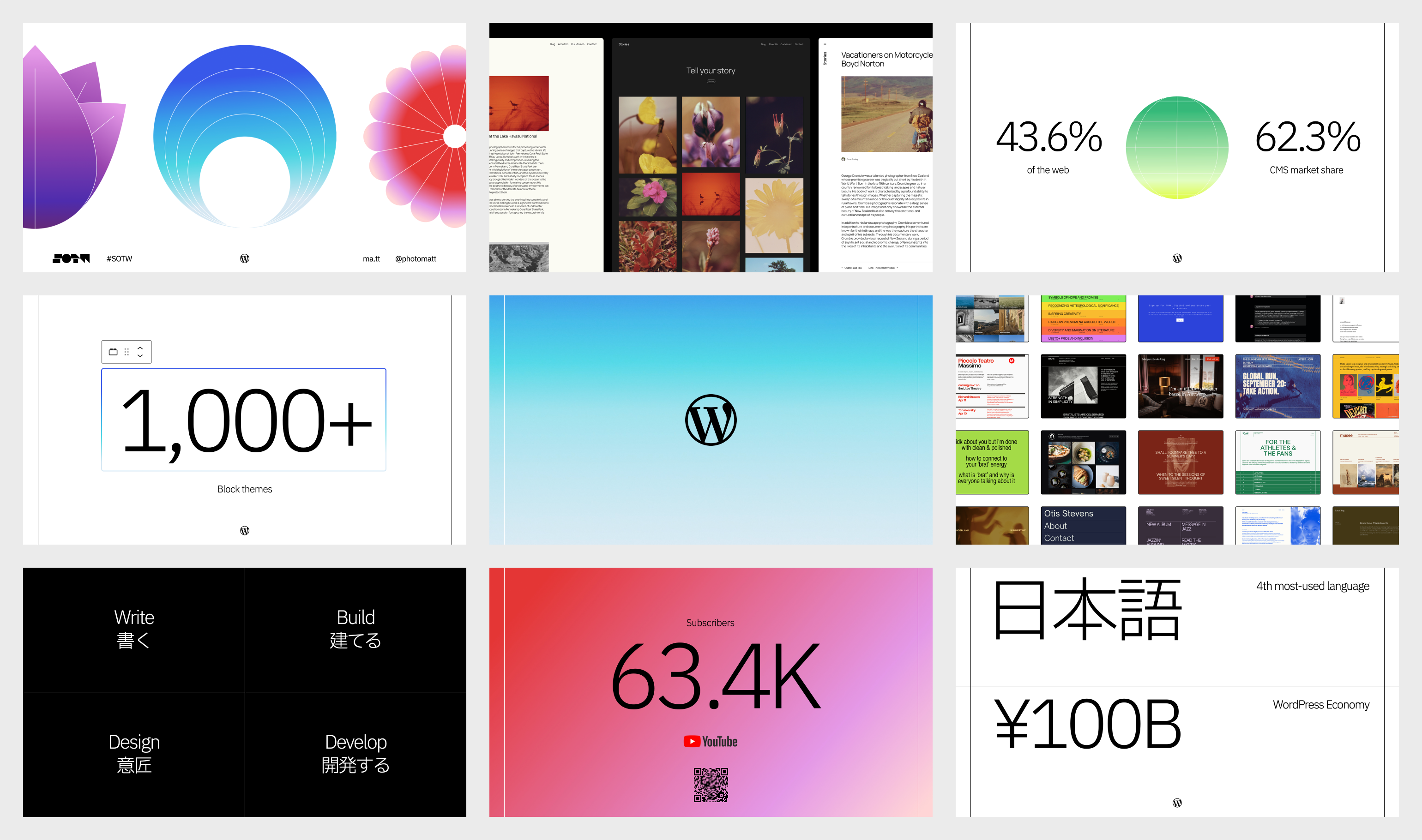 Our Keynote design wasn’t just a continuation of the foundations we’d established—it was a blend of our system with WordPress elements, especially visual content like product UI, photography, and demos. Below, you can see a few screenshots from the Keynote.