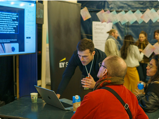 To ensure a thoroughly designed experience for our attendees, we carefully crafted a real-world journey, guiding them from the front door to the 46th floor. Beyond wayfinding signage, we paid close attention to every detail of the event experience—starting with reception, continuing through the keynote sessions, and culminating in the cocktail and networking moments. With each of these taking place in different rooms, we focused on a wide range of elements, from branded décor and printed menus to podium designs, briefing PDFs, digital screens in the hallways, seat reservations, and bespoke gifts created exclusively for our attendees and speakers.