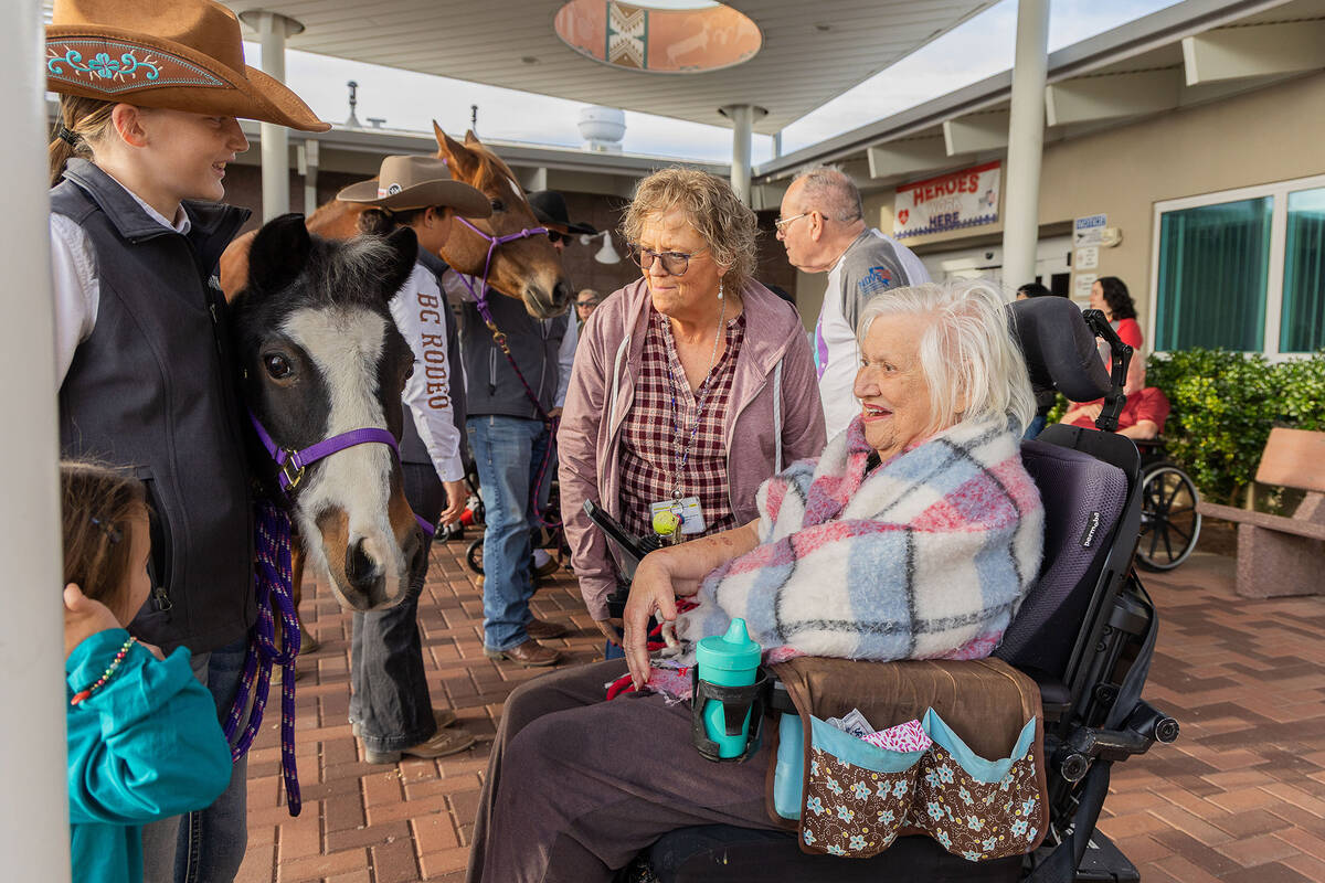 The Boulder City Rodeo Club showcased its dedication to the community on Sunday, Nov. 30 with a visit to the Southern Nevada State Veterans Home. The team arrived with several of their horses and brought Christmas gift donations that the home had specifically requested for their residents. These included puzzles, headphones, and chargers, which the home will give as Christmas gifts. The kids spent quality time with the residents, talking with them, getting to know their stories, and connecting over shared interests. Many of the veterans had backgrounds in horses or equestrian life. The team sang Christmas carols and the “Star-Spangled Banner”, filling hearts with warmth and holiday spirit. Community service has always been at the heart of this club. Throughout the year, the team volunteers at local events such as Art in the Park, Wurstfest, Spring Jamboree, and many others, along with participating in community cleanups.
