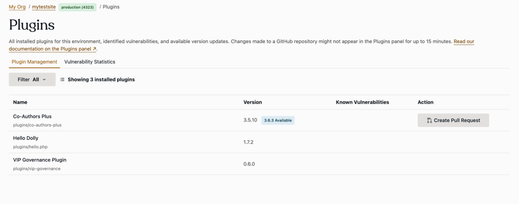 If a Codebase Manager scan has identified a known security vulnerability or an available version update for a plugin, a button labeled “Create Pull Request” will be available in the “Action” column. Selecting the button will trigger a pull request containing the most recent version of the plugin to be created. The pull request will be made against the GitHub branch that deploys to the environment currently being viewed in the VIP Dashboard.