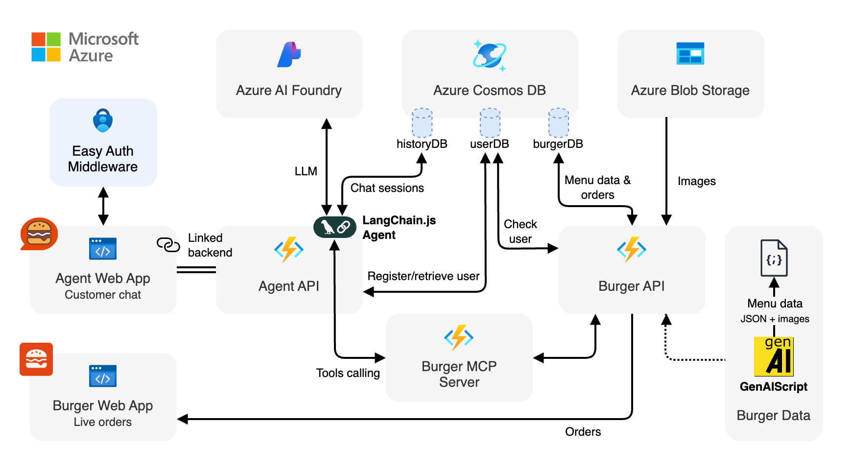 Building AI applications can be complex and time-consuming, but using LangChain.js and Azure serverless technologies allows to greatly simplify the process. This application is a AI agent that can be access through different interfaces (web app, CLI) and that can call tools through MCP to interact with a burger ordering API.