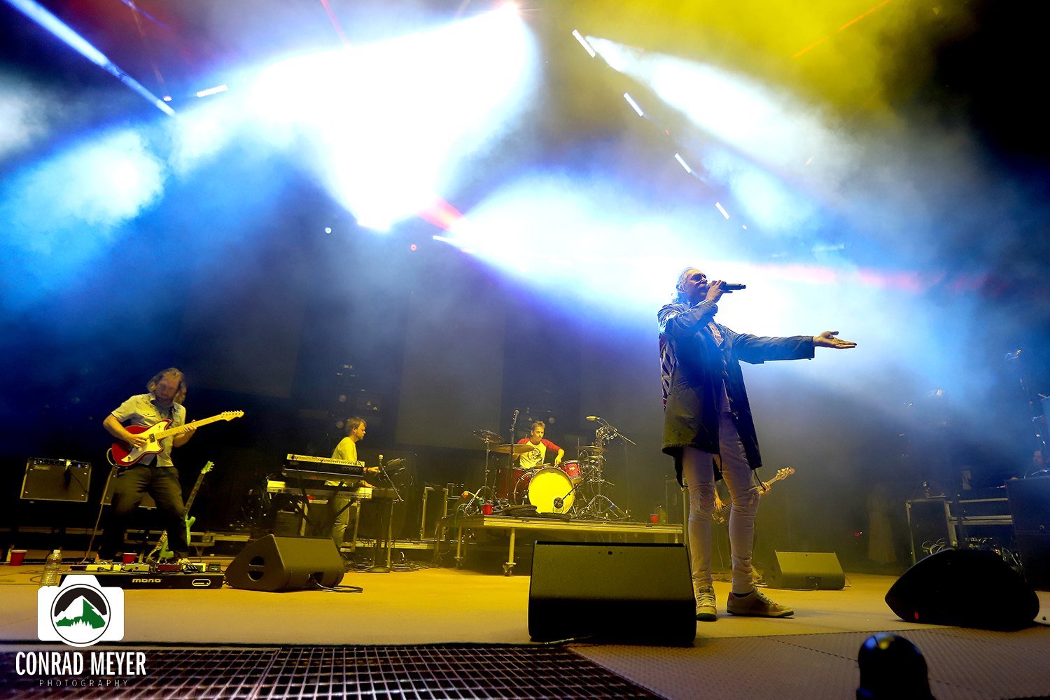 At the last half of dusk, reggae hip-hop project Matisyahu took over the stage to lay down some inspiring lyrics over beachy melodies. The Brooklyn five-piece kicked things off with two light reggae jams, then busted out their psychedelic “Driftin’” from their 2017 Undercurrent LP for the third song of the night. The group tranced the crowd with a hazy daze instrumental before Matisyahu layed down some downtempo beatboxing. His rhythm was accompanied by trancelike, airy guitar riffs by Aaron Dugan, and the band quickly took the beat to a crescendo thanks to a quick transition by keyboardist Yuki. The latter led into the upbeat “Sunshine” as the crowd sang along with Matisyahu’s “golden sunshine” lyrics while red, orange, and yellow lights beamed out as rays of sun. The band welcomed HIRIE up onstage for some smooth vocal accompaniment, and as the final chords were struck in the final song, Matisyahu signed off with harmonizing vocals and a “peace, peace” to the crowd.