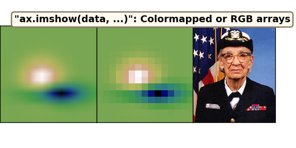 # We won't dwell too much on the differences and overlaps here. They have overlapping capabilities, but different default behavior because their primary use-cases are a bit different (there's also `matshow`, which is `imshow` with different defaults).