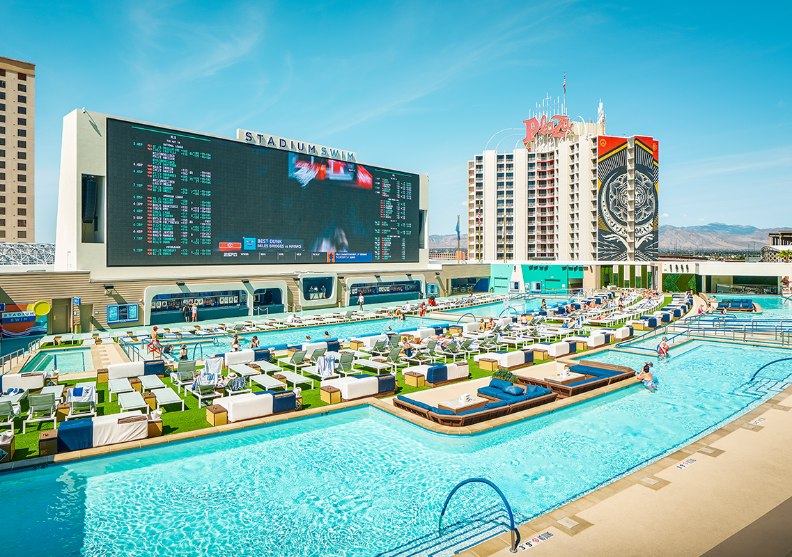 Say goodbye to conference rooms and hello to sunlight and neon. Our rooftop pool amphitheater features a 40-foot tall screen, hundreds of chaises lounges and six tiered pools for unmatched views.