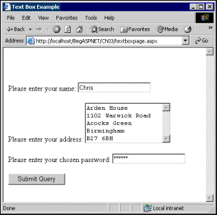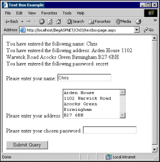 the textbox control to ask for the name and address of the user, and a password