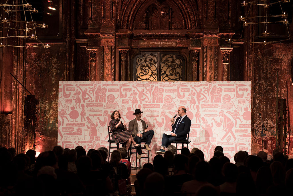 Mitchell Davis and Russ & Daughter’s Niki Russ Federman and Josh Russ Tupper on stage at “Schmaltzy,” storytelling and tasting event at the Angel Orensanz Foundation, NYC