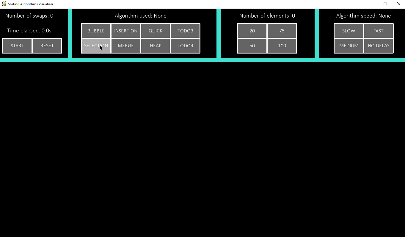 The user is able to select an algorithm from a selection to visualize and also customize the number of elements in the list to be sorted and the speed at which the visualization to run. After selecting all the necessary parametes the user can choose to start the algorithm visualization. After the algorithm has finished, the user can choose to reset the application in order to select different parameters to test.