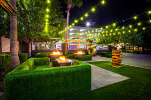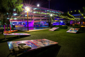 Experience interactive (over-sized) games and uniquely programmed specials events. The outdoor courtyard, also known as the “Backyard,” features a variety of over-sized games, a main stage, tiny house, and bar. During the day, the Backyard makes for a fun hangout, and during the evening it transforms into an energetic nightlife venue. Lounge seating is available with close proximity to firepits and space heaters.