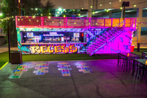A bar installation built out of a shipping container. The Recess bar features a custom art mural, a custom sculpture and viewing deck.