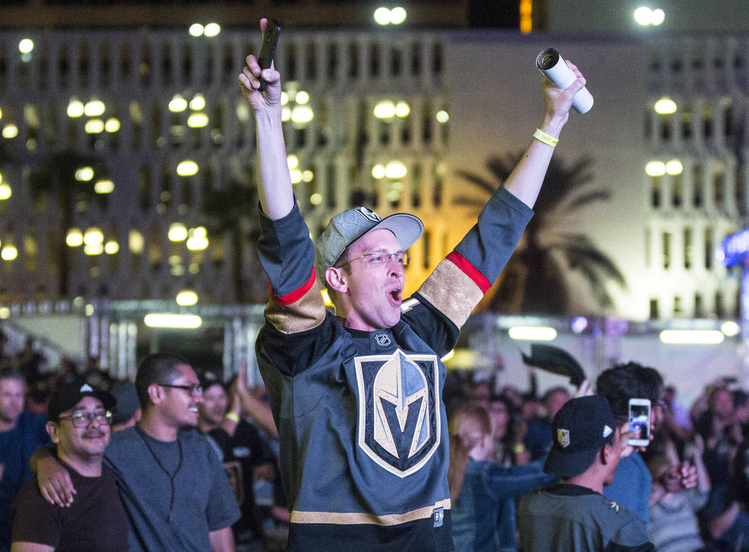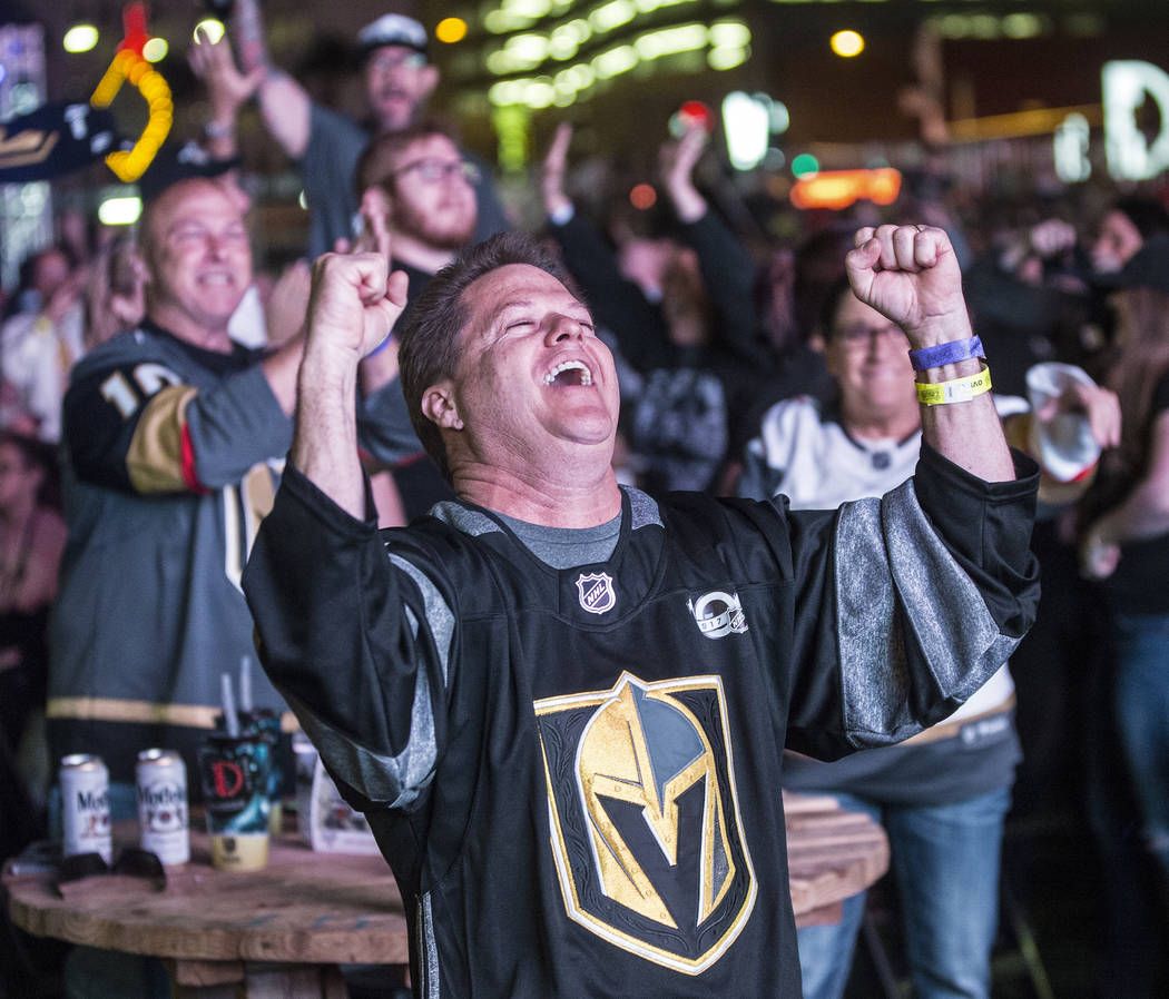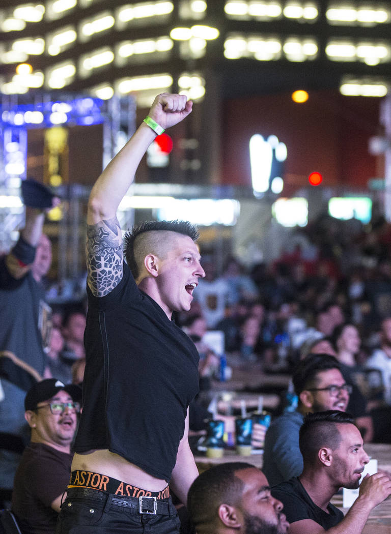Golden Knights fan Anthony Soleau cheers after a second period goal at a watch party during game three of Vegas' playoff series with the San Jose Sharks on Monday, April 30, 2018, at Downtown Las Vegas Events Center, in Las Vegas. Benjamin Hager Las Vegas Review-Journal @benjaminhphoto