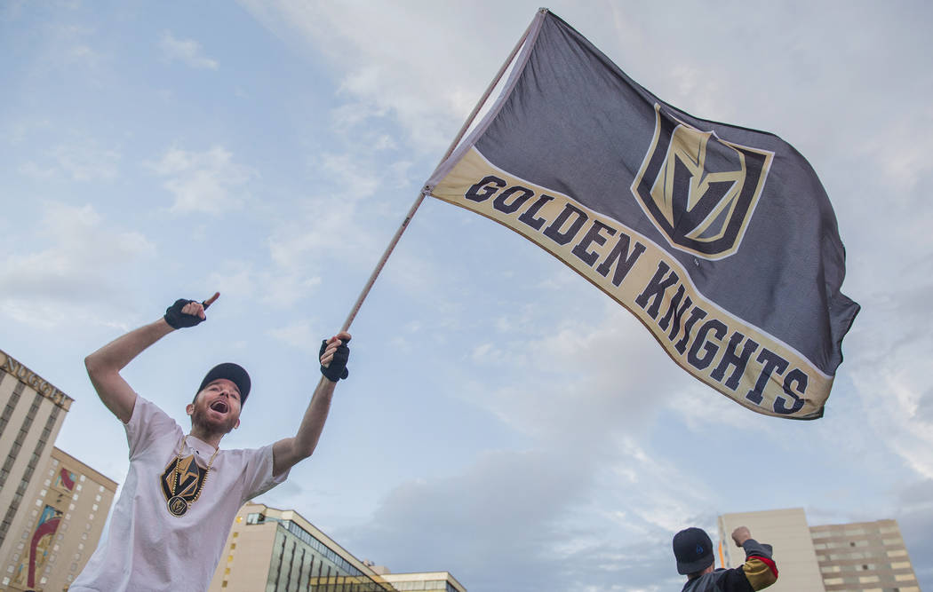 Golden Knights fan Matt Helfst waves his team's flag at a watch party during game three of Vegas' playoff series with the San Jose Sharks on Monday, April 30, 2018, at Downtown Las Vegas Events Center, in Las Vegas. Benjamin Hager Las Vegas Review-Journal @benjaminhphoto