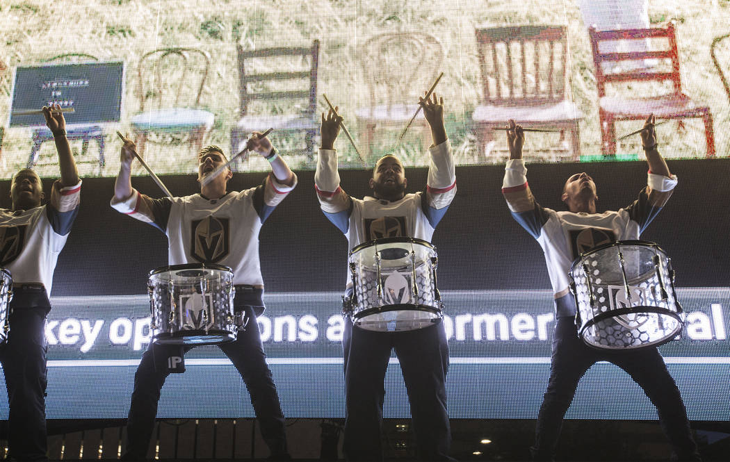 The Knightline drummers perform during game three of the Golden Knights playoff series with the San Jose Sharks on Monday, April 30, 2018, at Downtown Las Vegas Events Center, in Las Vegas. Benjamin Hager Las Vegas Review-Journal @benjaminhphoto