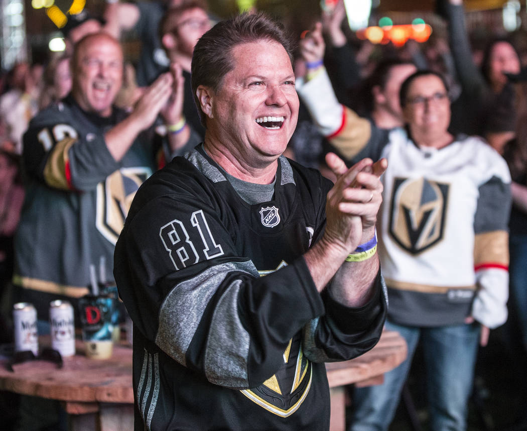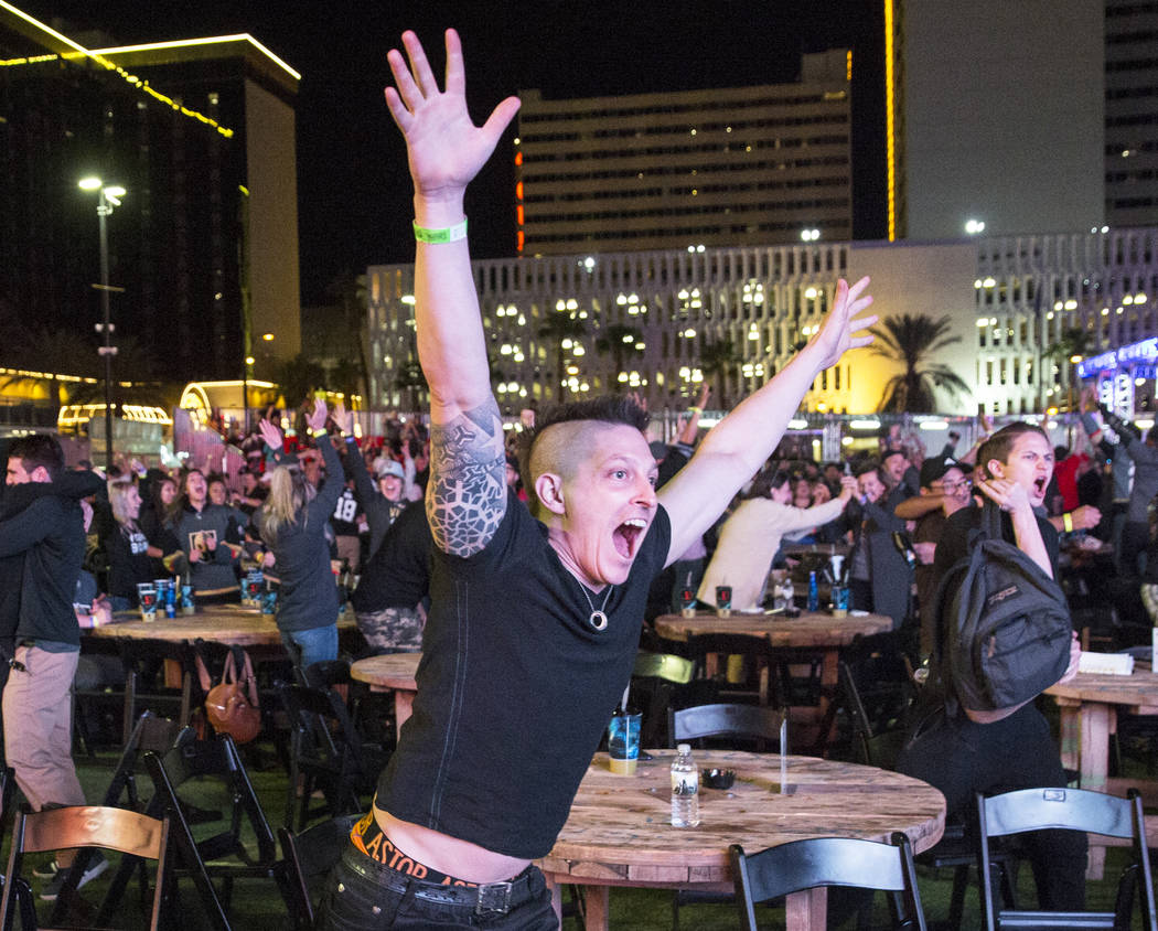 Golden Knights fan Rob Lawrence celebrates after a second period goal at a watch party during game three of Vegas' playoff series with the San Jose Sharks on Monday, April 30, 2018, at Downtown Las Vegas Events Center, in Las Vegas. Benjamin Hager Las Vegas Review-Journal @benjaminhphoto