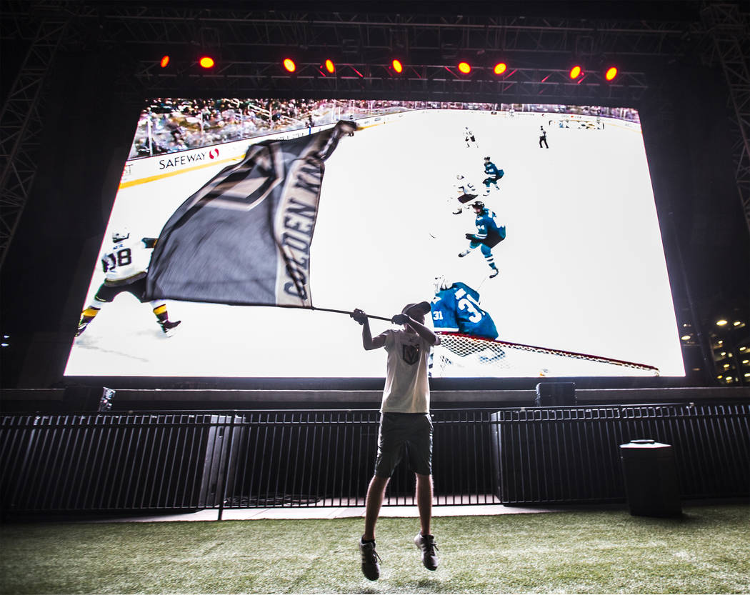 Golden Knights fan Matt Helfst waves his team's flag after a second period goal at a watch party during game three of Vegas' playoff series with the San Jose Sharks on Monday, April 30, 2018, at Downtown Las Vegas Events Center, in Las Vegas. Benjamin Hager Las Vegas Review-Journal @benjaminhphoto