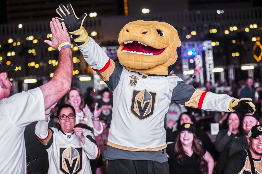 Golden Knights mascot Chance, right, celebrates with fan Bernie Lange after a second period goal at a watch party during game three of Vegas' playoff series with the San Jose Sharks on Monday, April 30, 2018, at Downtown Las Vegas Events Center, in Las Vegas. Benjamin Hager Las Vegas Review-Journal @benjaminhphoto