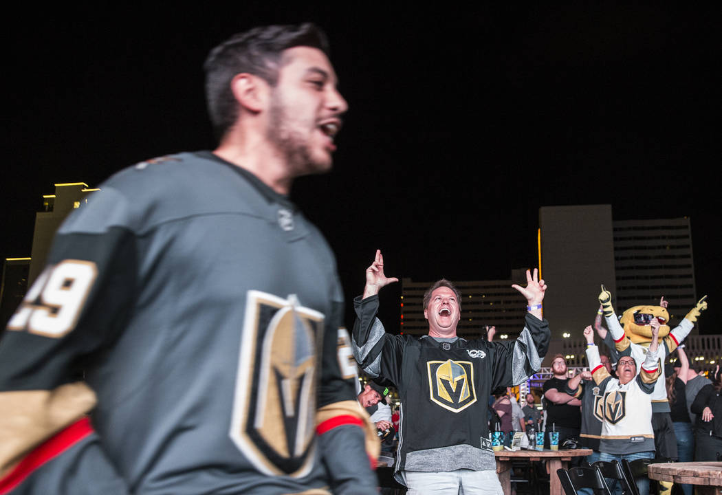 Golden Knights fan Billy Kesner, middle, celebrates at a watch party after Vegas' William Karlsson scored an overtime goal to beat the San Jose Sharks 4-3 during game three of Vegas' playoff series on Monday, April 30, 2018, at Downtown Las Vegas Events Center, in Las Vegas. Benjamin Hager Las Vegas Review-Journal @benjaminhphoto
