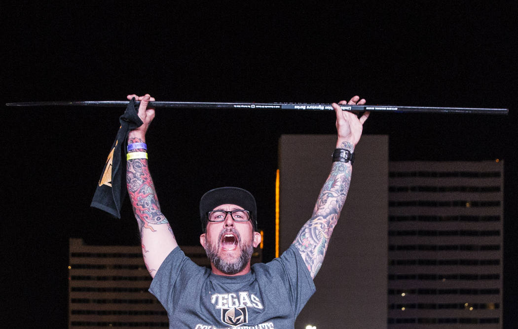 Golden Knights fan Rob Lawrence, middle, celebrates at a watch party after Vegas' William Karlssonscored an overtime goal to beat the San Jose Sharks 4-3 during game three of Vegas' playoff series on Monday, April 30, 2018, at Downtown Las Vegas Events Center, in Las Vegas. Benjamin Hager Las Vegas Review-Journal @benjaminhphoto